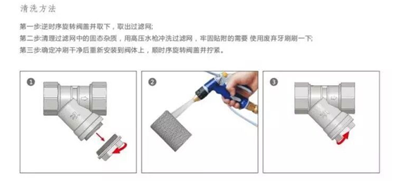 地暖每年在使用前應(yīng)清洗一次過濾器。具體方法如下:首先關(guān)閉連接導(dǎo)管的進(jìn)、回水閥門,然后打開過濾器、過濾網(wǎng)并清洗干凈,檢查過濾網(wǎng)有無破損及堵塞。如有損壞,應(yīng)換上同規(guī)格的過濾網(wǎng),按原樣裝好即可。